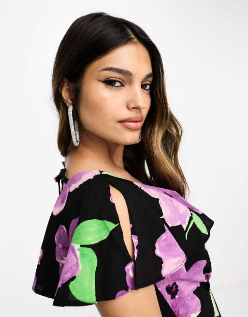 ASOS DESIGN flutter sleeve midi tea dress with buttons in large purple floral print Very well made.